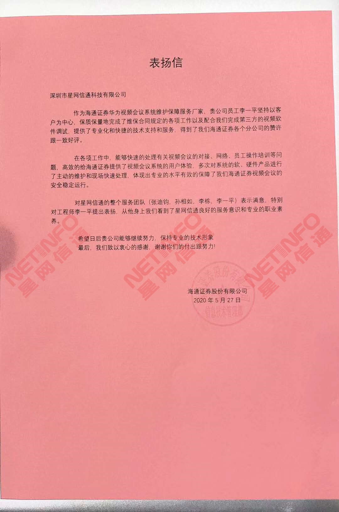 我司2020年承接的海通證券股份有限公司--華為視頻會議系統維護保障服務項目,在項目維護過程中,項目組成員體現了極強的專業素養,克服了種種困難,圓滿提前完成了任務,獲得了客戶極高的評價和認可。客戶的滿意是星網信通存在的最大價值,我們感謝海通證券股份有限公