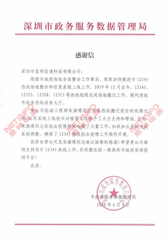 我司2019年承接的深圳市政府--12345熱線項(xiàng)目,在項(xiàng)目過(guò)程中,我司駐場(chǎng)工程師體現(xiàn)了極強(qiáng)的專業(yè)素養(yǎng),克服了種種困難,圓滿提前完成了任務(wù),獲得了客戶極高的評(píng)價(jià)和認(rèn)可。客戶的滿意是星網(wǎng)信通存在的最大價(jià)值,我們感謝深圳市政府對(duì)我們的認(rèn)可與信任,這無(wú)疑是對(duì)我們最大的鼓勵(lì)。星網(wǎng)會(huì)努力做得更好,只為了給客戶最好的守護(hù),做您最強(qiáng)的后盾。